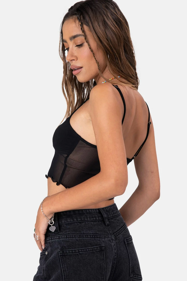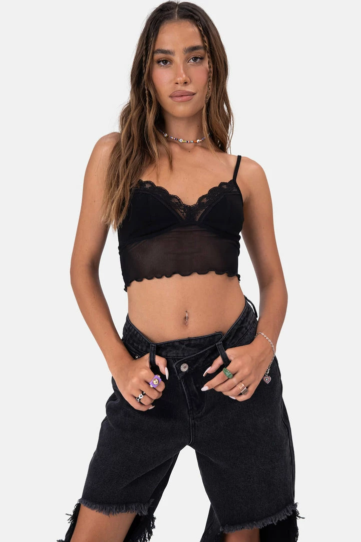 - Hell of a mash. Cami-style cropped top in mesh fabric featuring a sweetheart neckline with lace trim, adjustable spaghetti straps, non-padded cup detail and a wavy hem.