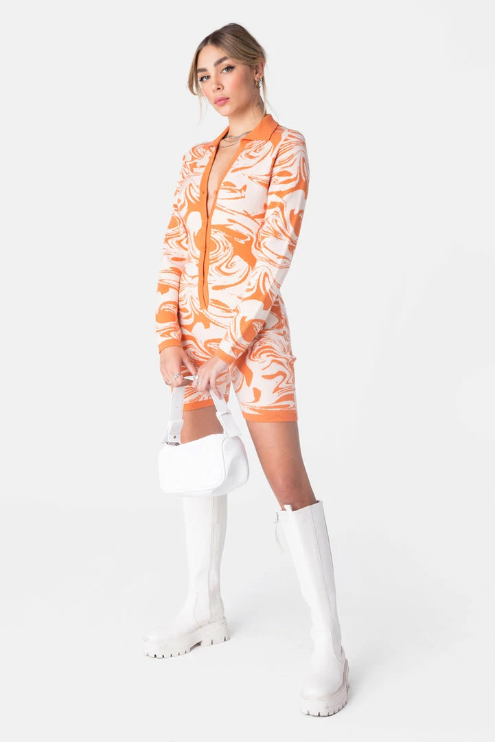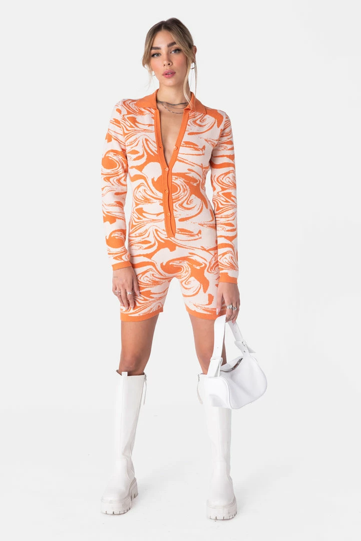 - Cool days on ma mind. Long sleeved romper in all-over, stretchy knit, marble print with button closure and classic collar.