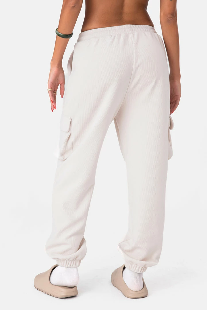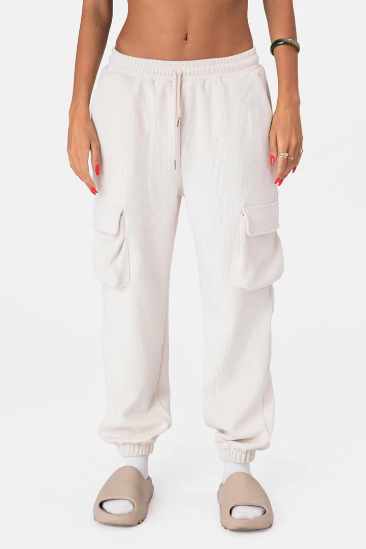 - The drip is real. Corduroy sweatpants in a relaxed fit featuring an elastic waistband with drawstring, diagonal front pockets, side cargo pockets and fitted cuffs.