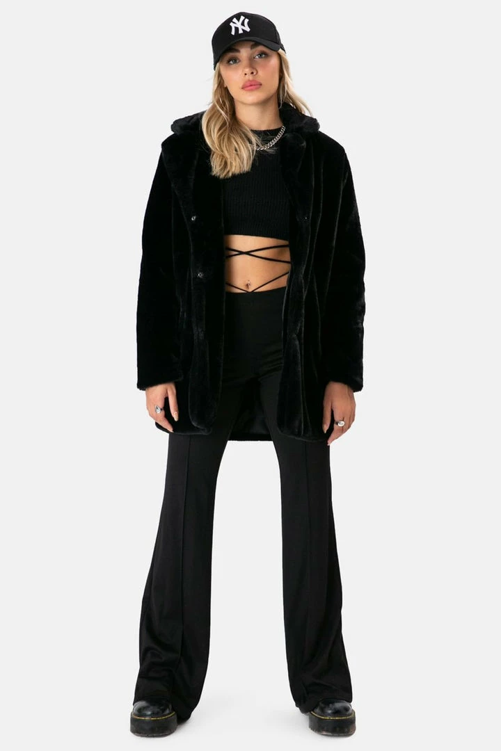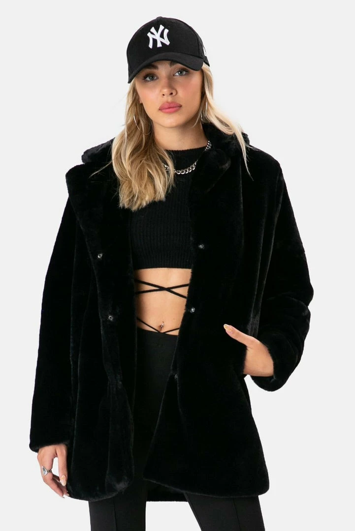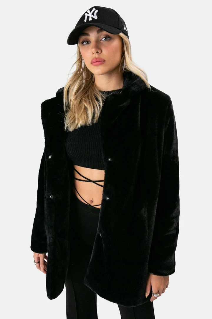 - Literally goes with any look! Oversized faux-fur coat with notch lapels, snap-button closure and super-soft inner lining. You need this, fur real.