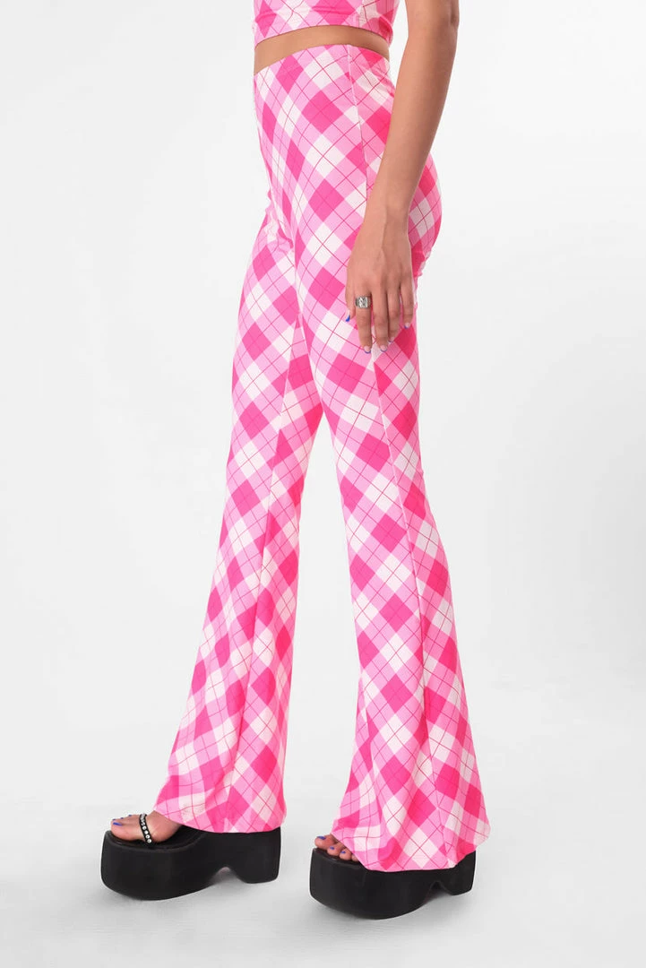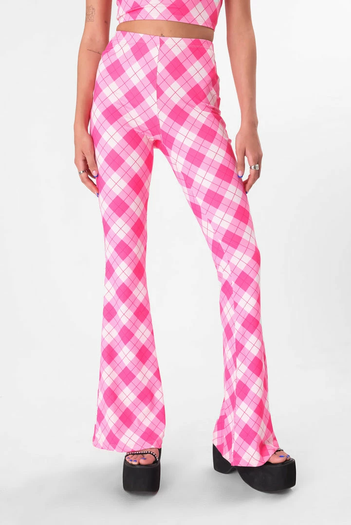 - Cool girl meets cottagecore. Lightweight stretchy pants in all-over plaid print featuring high waisted fit, elastic waistband and groovy bell bottom.