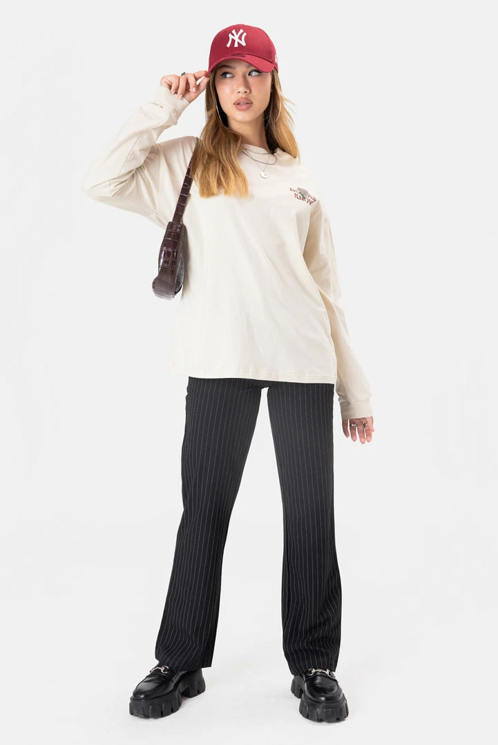 - What’s tee? Oversized T-shirt featuring graphic print on the front and back, long sleeves with fitted cuffs, crewneck and dropped shoulder line.