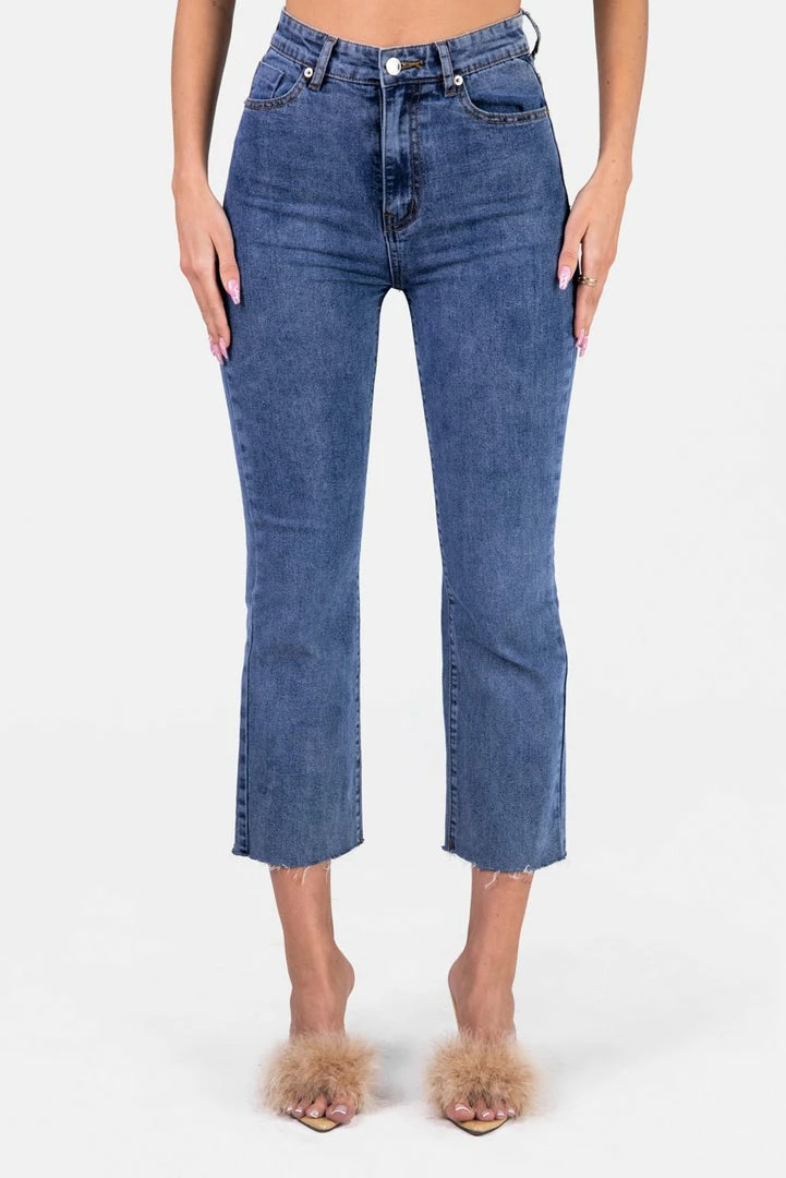- Denim but make it timeless. High waisted jeans in straight leg fit with a button and zip closure, belt loops, 5 pocket design and raw-cut, cropped hem.