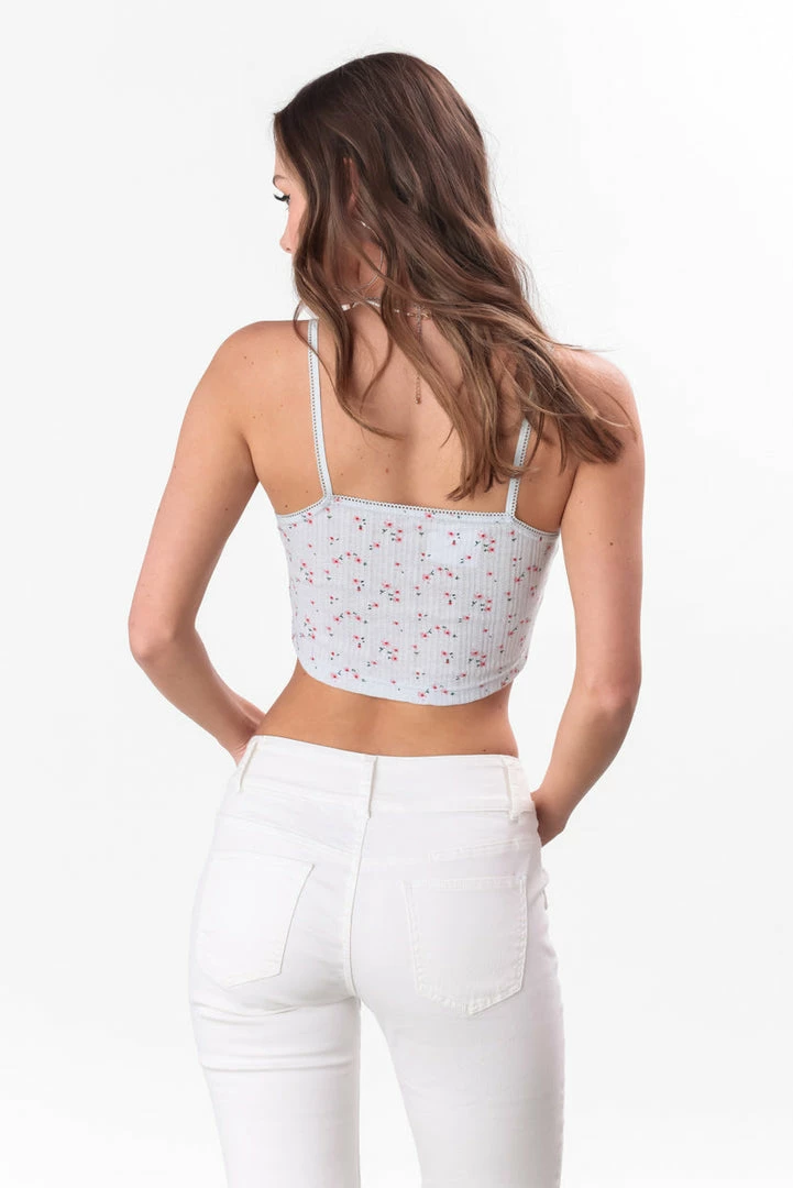 - Got a sweet tooth. Cami-style crop top in all-over floral print featuring a sweetheart neckline with small bow detail and stretchy shoulder straps with lace trim.