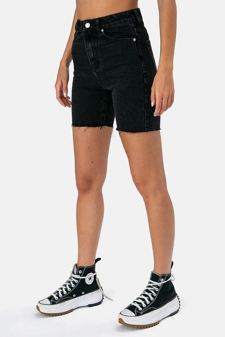 - When biker shorts go denim: denim shorts in mid-thigh length in a sick wash. With both front and back pockets and classic zip and button closure.