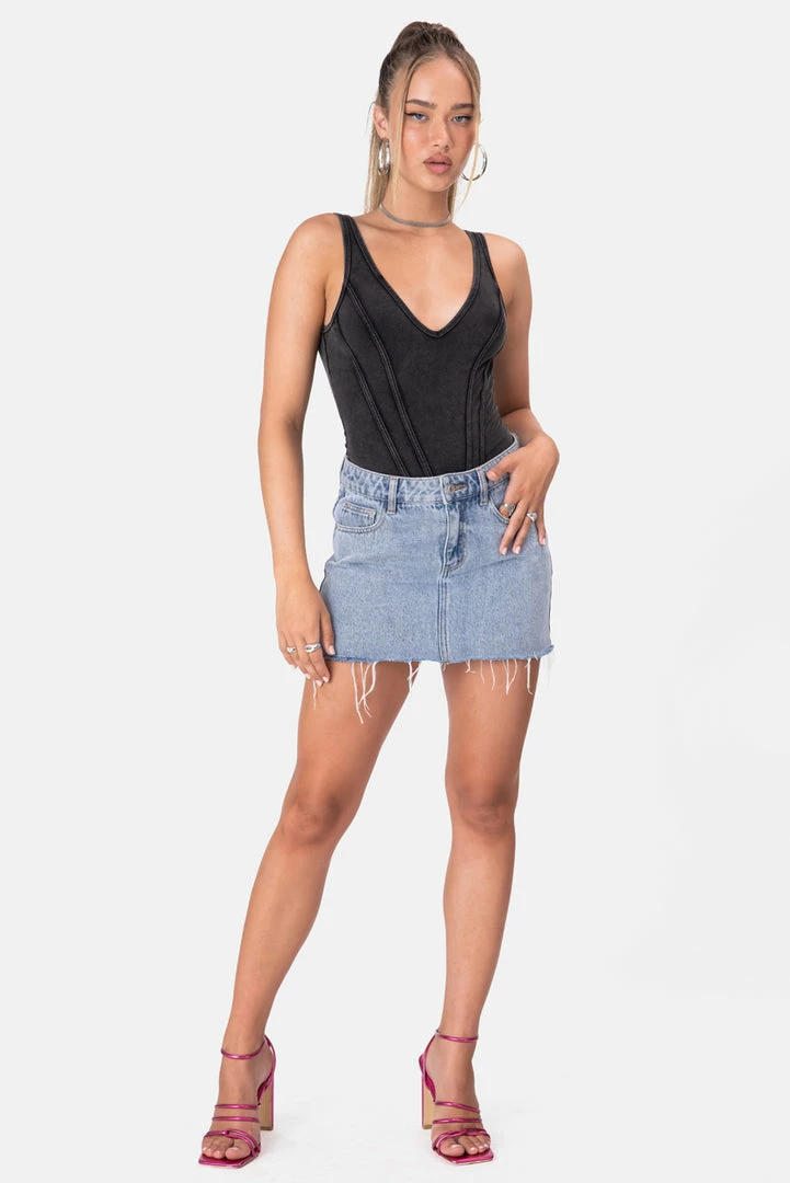 - V V chic. Sleeveless bodysuit in dark wash jersey featuring a V neck, scoop back, tonal seam detail in the front and hidden snap button closure.