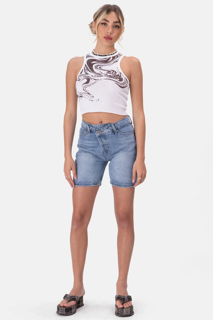 - Got ya all wrapped up. Longline denim shorts in a high waisted fit and an above-the-knee length with a light wash finish. Featuring a wrap front with button closure, front round pockets and back patch pockets.