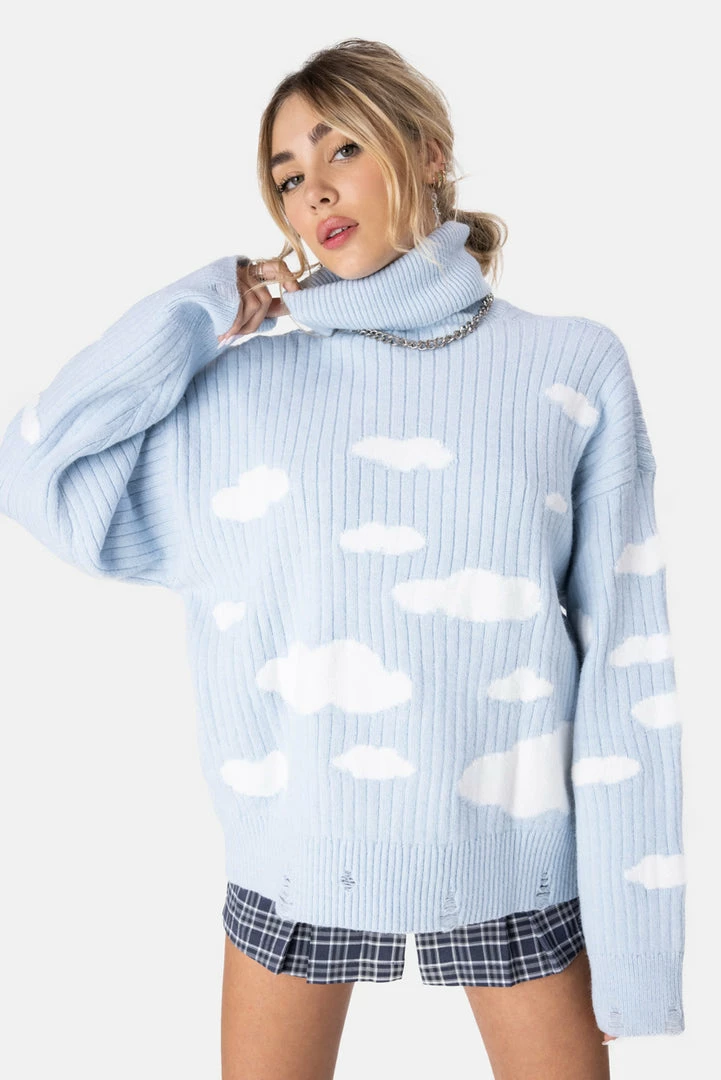 - Head up in the clouds. Oversized knit sweater with woven-in clouds pattern, turtleneck, ribbed outline, and distressed details.