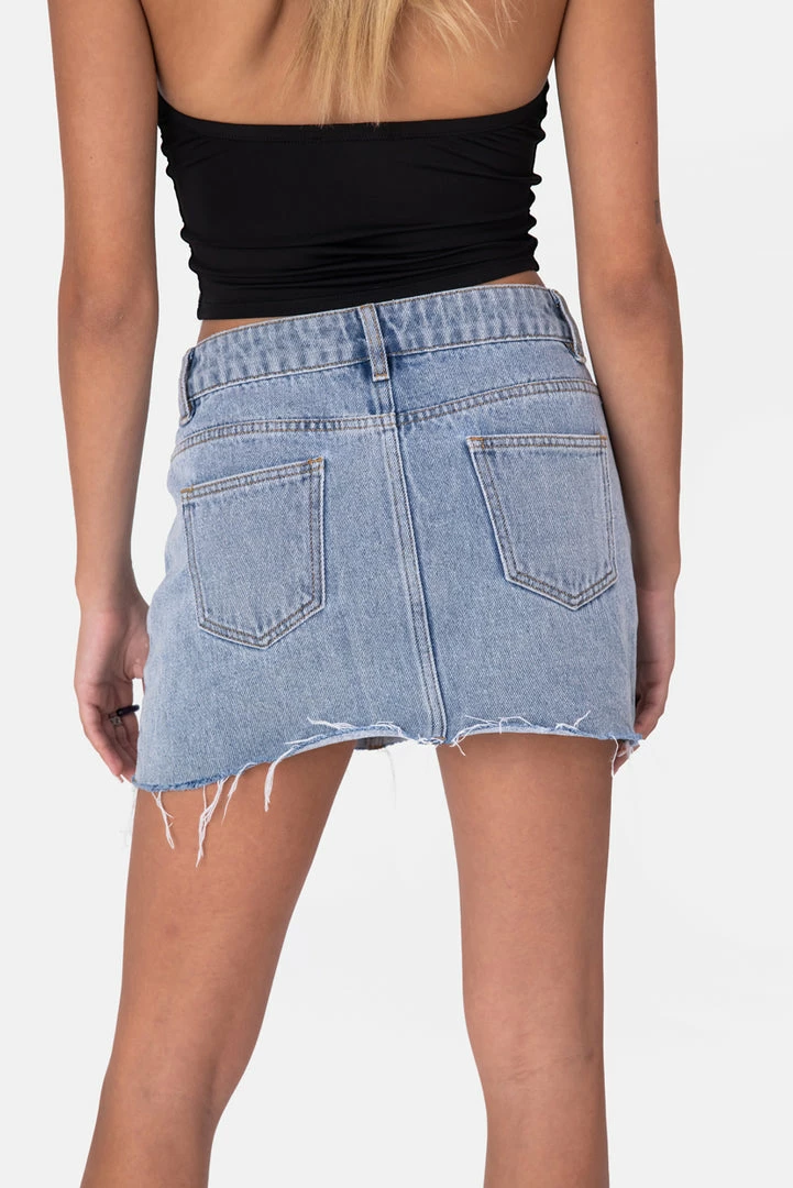 - Found: a serious new denim obsession. Denim mini skirt in a natural waist rise with button and zip closure, 5-pocket design and raw-cut hem.