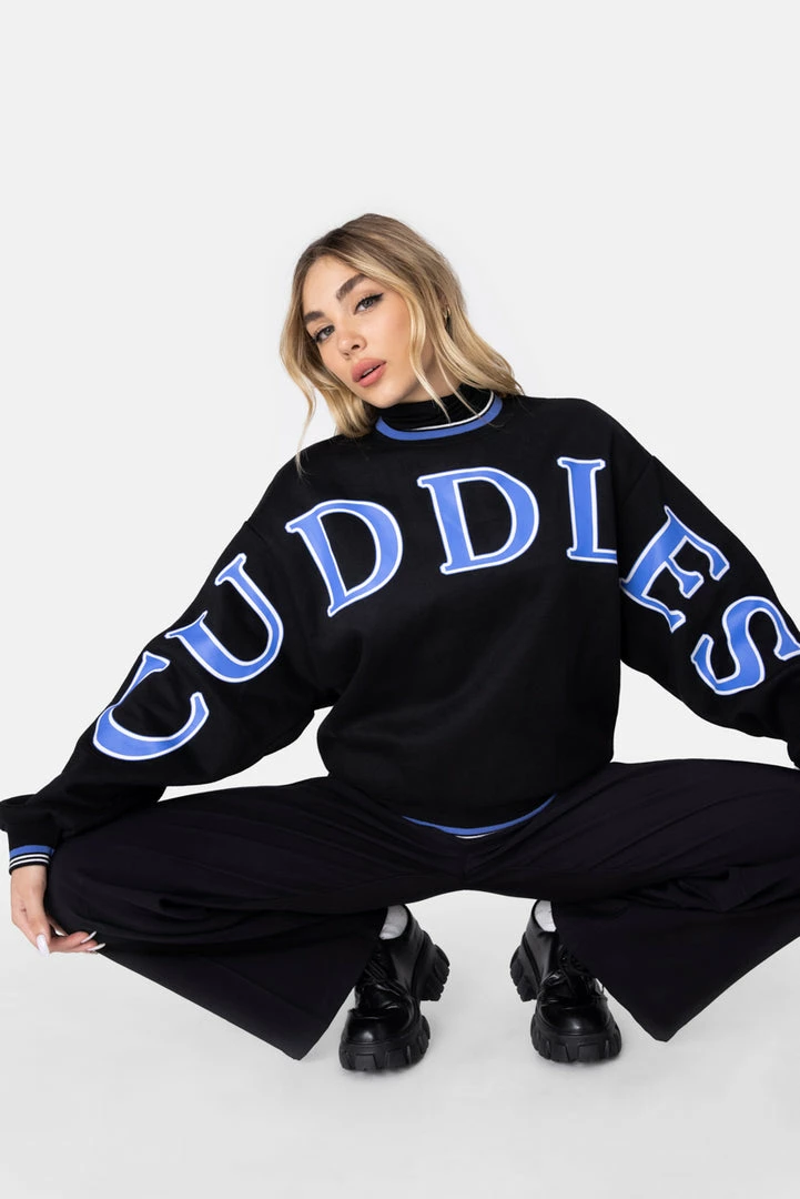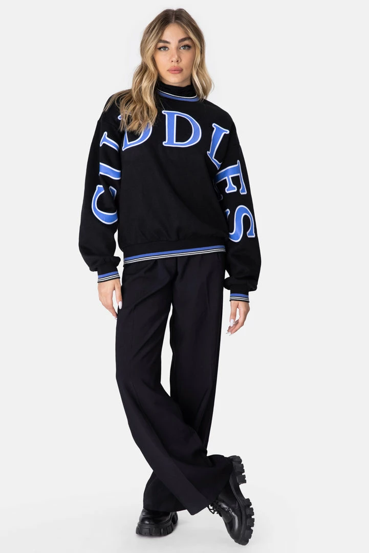 - ‘Tis the szn for cuddles. Warm sweatshirt with graphic print on the front, dropped shoulder line, striped ribbed outline banded outline and a high collar.