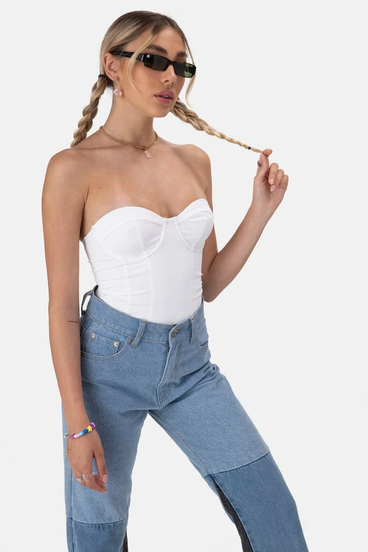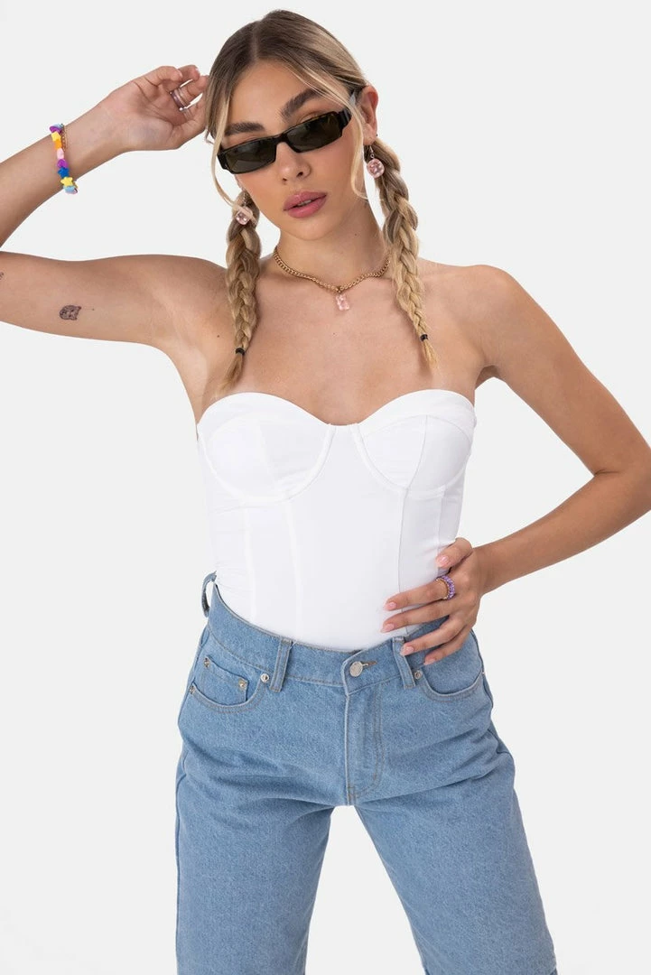 - Work it, babe. Corset-style, strapless bodysuit with sweetheart neckline, cup detail, tonal seam detail and a hidden snap button closure.