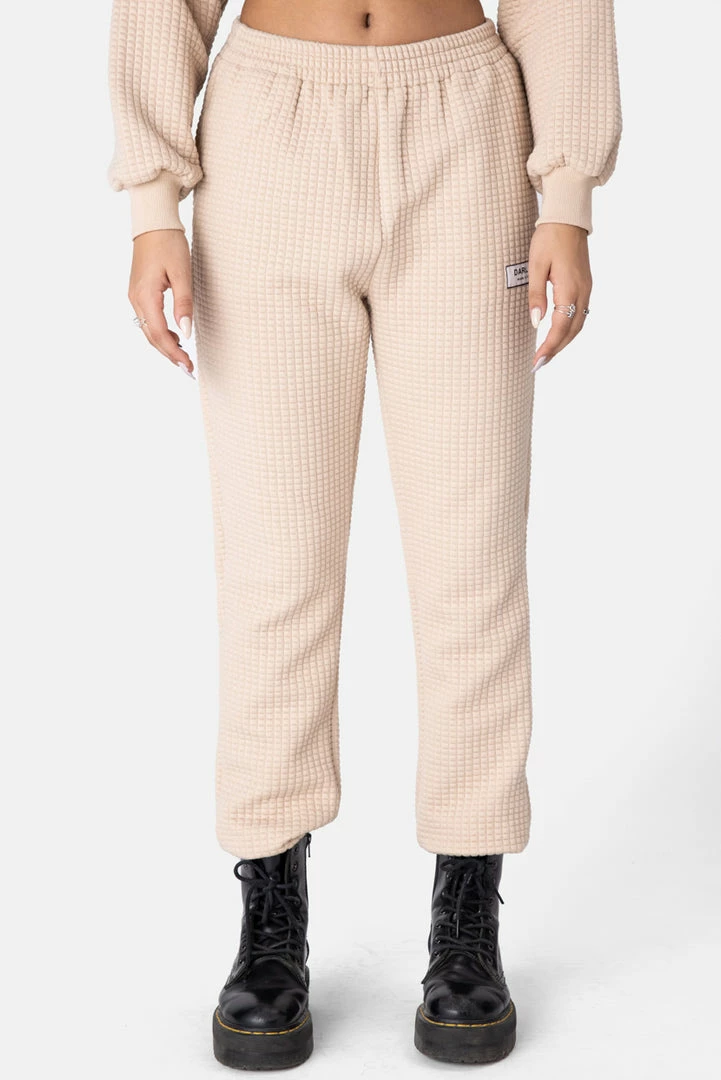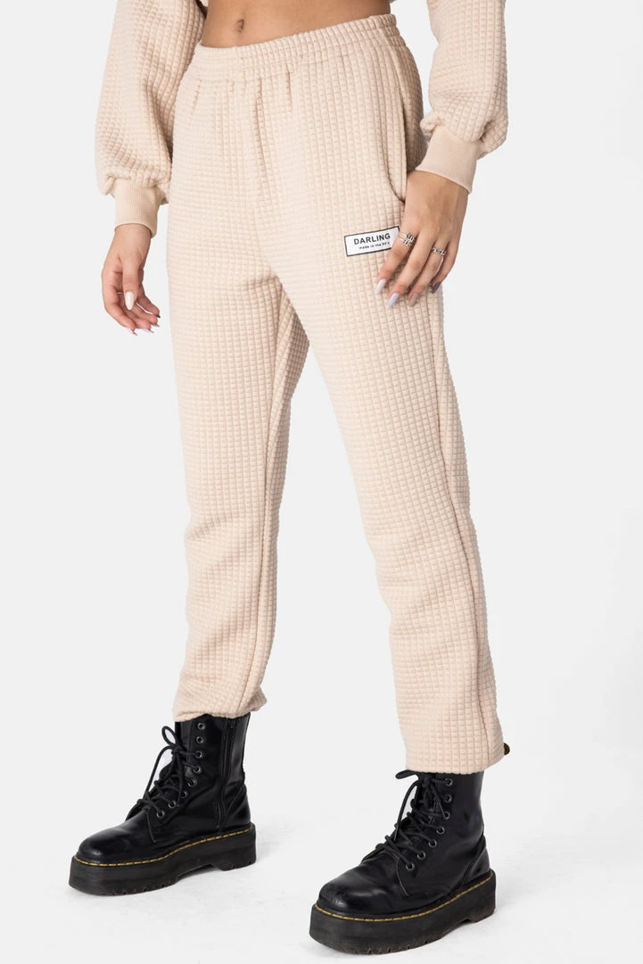 - Darling, you’re so gonna love this one. These sweatpants come in super-fun waffle-knit fabric, featuring a cute patch on the left leg and elasticized hem and cuffs.