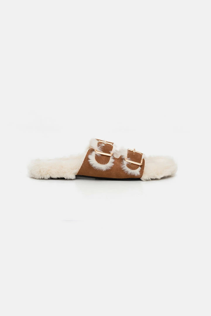 - In ma comfort zone. Slip-on sliders with mega-cozy faux fur footbed, round toe and double straps with buckle closure in faux suede.