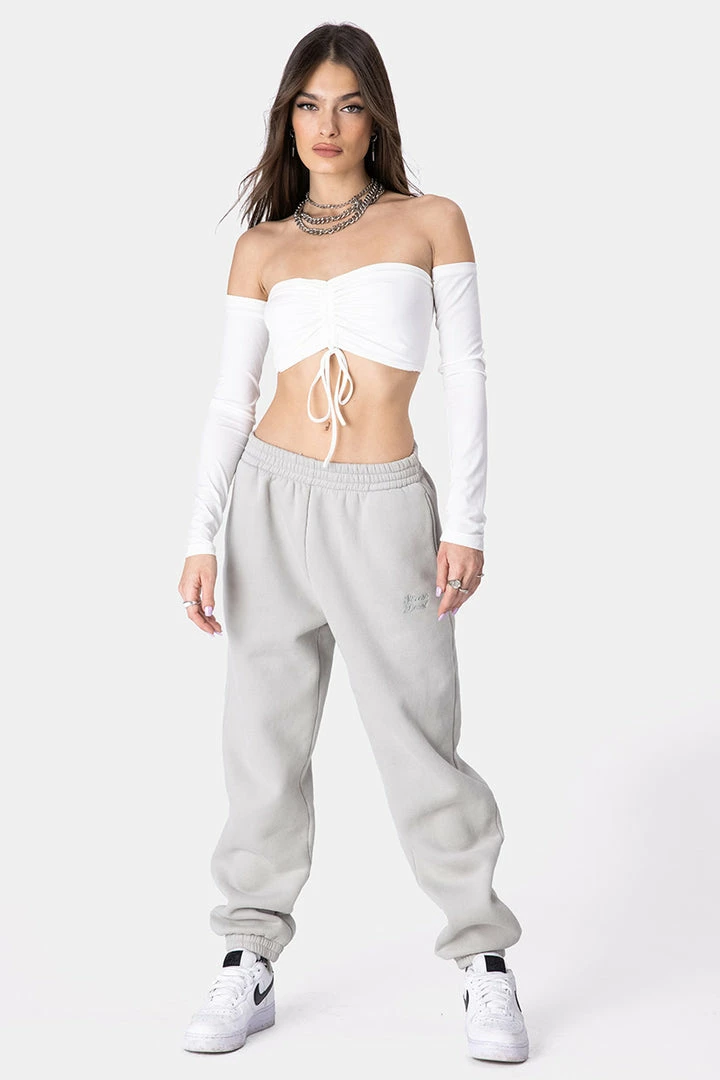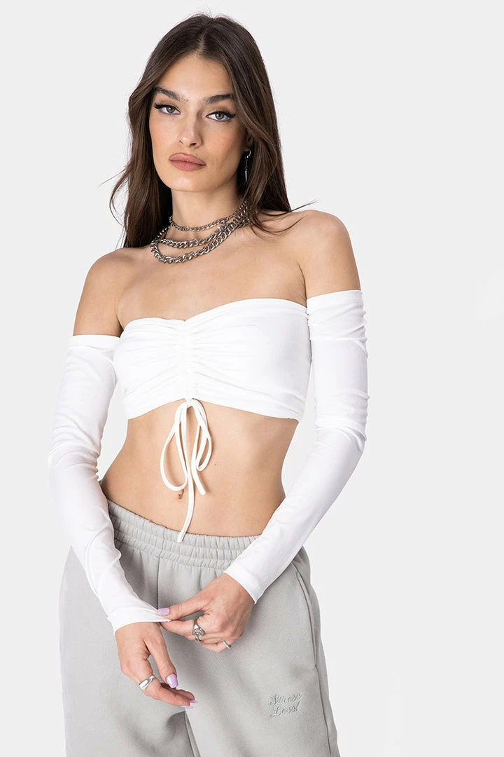- What’s up your sleeve? Bandeau style cropped off-shoulder top in a stretchy ribbed fabric with ruched front, elasticized neckline and long sleeves.