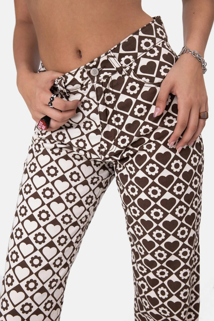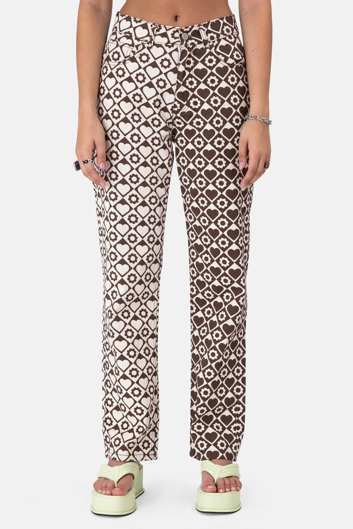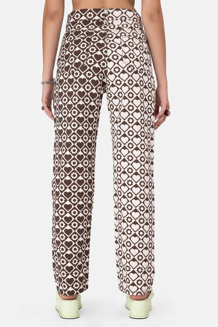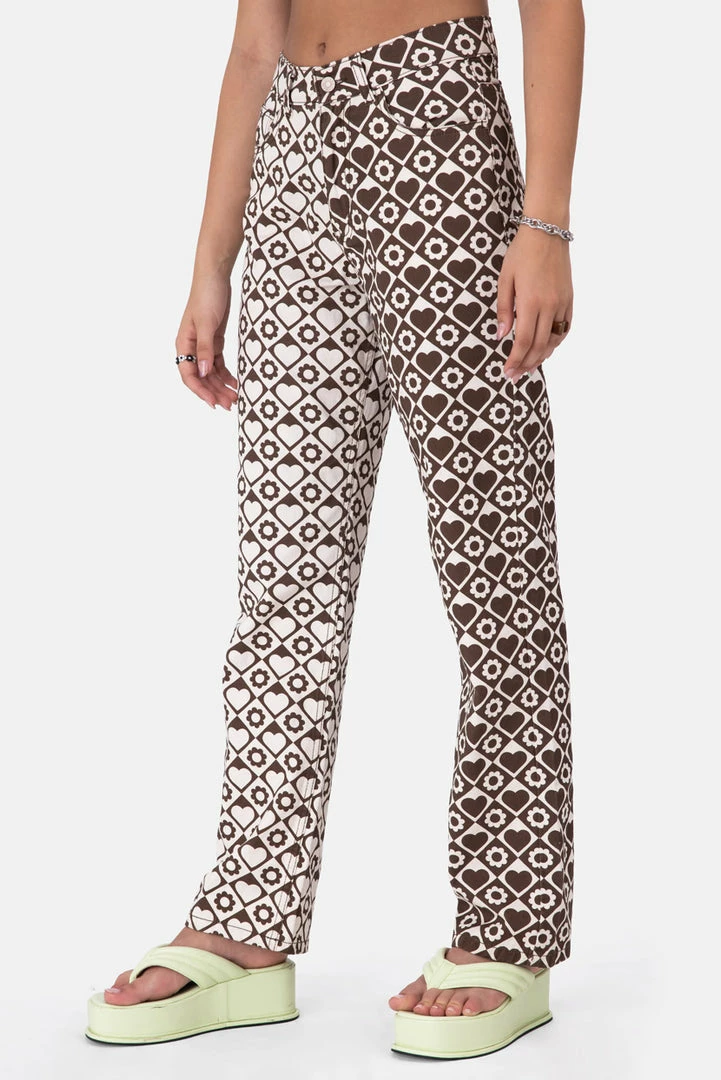 - Will make your heart go woosh. High-waisted, straight fit pants featuring a super-groovy print all-over in a color-block design with button and zip closure, belt loops and 5-pocket design.