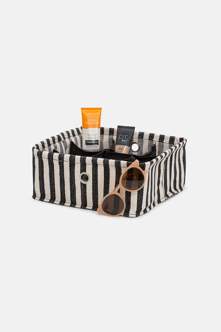 - Line ‘em up. Rectangular canvas basket in all-over stripes pattern with 9 compartments and side metal ring detail.