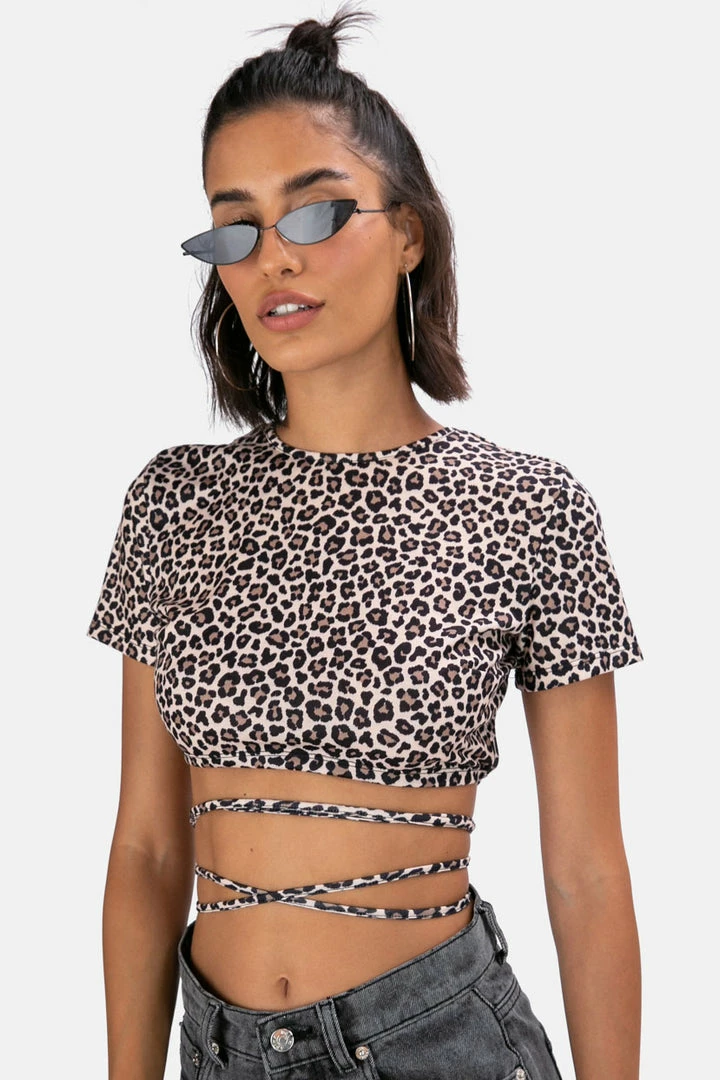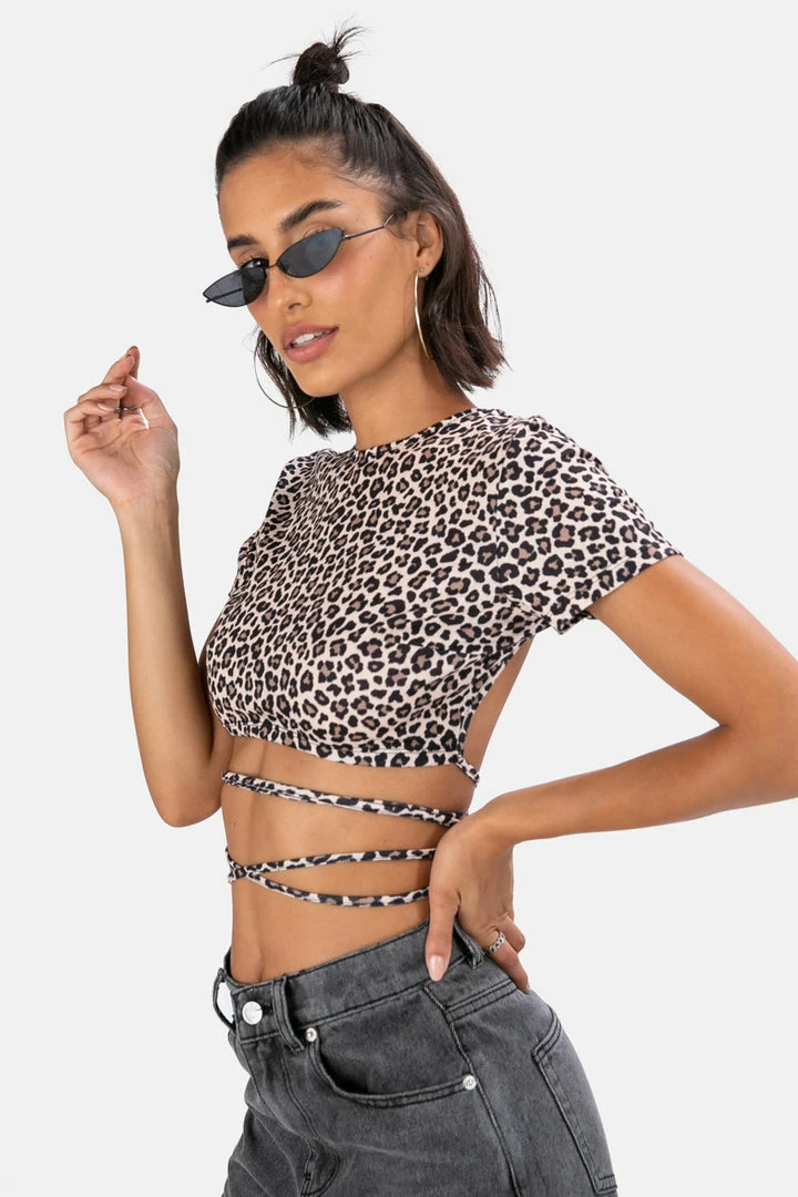 - Business in the front, party in the back! Cropped tee with long tie strings that you can wear anyway you choose, and exposed back for extra style.