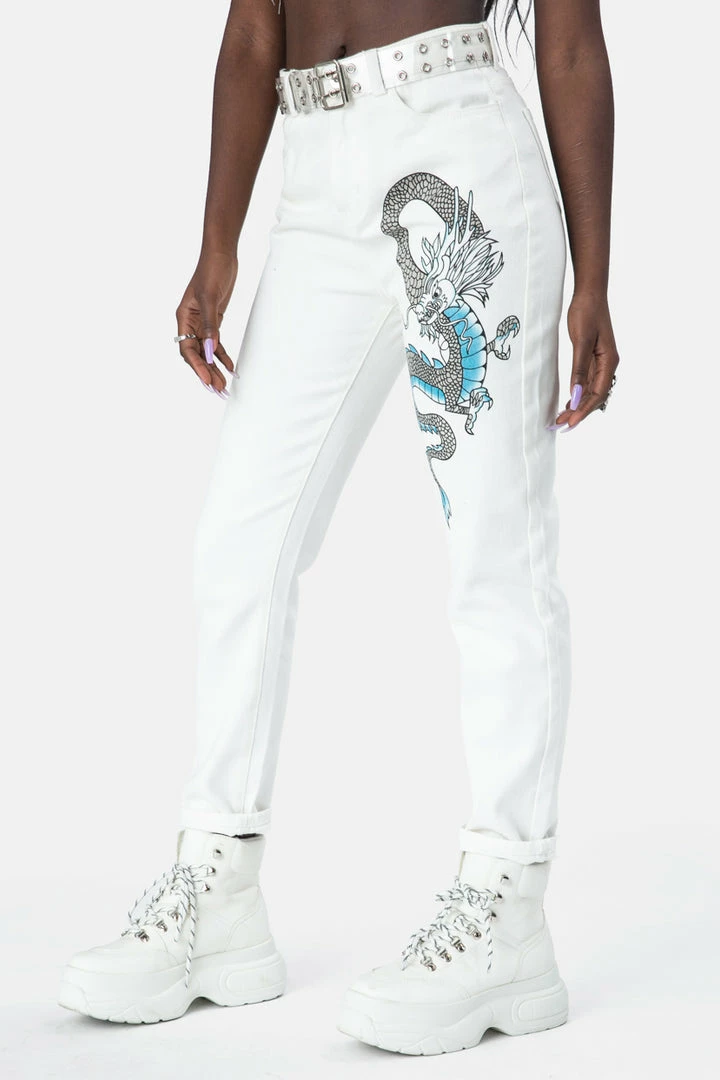- EYE OF THE DRAGON! High-waisted jeans featuring a sick dragon print in front and functional pockets