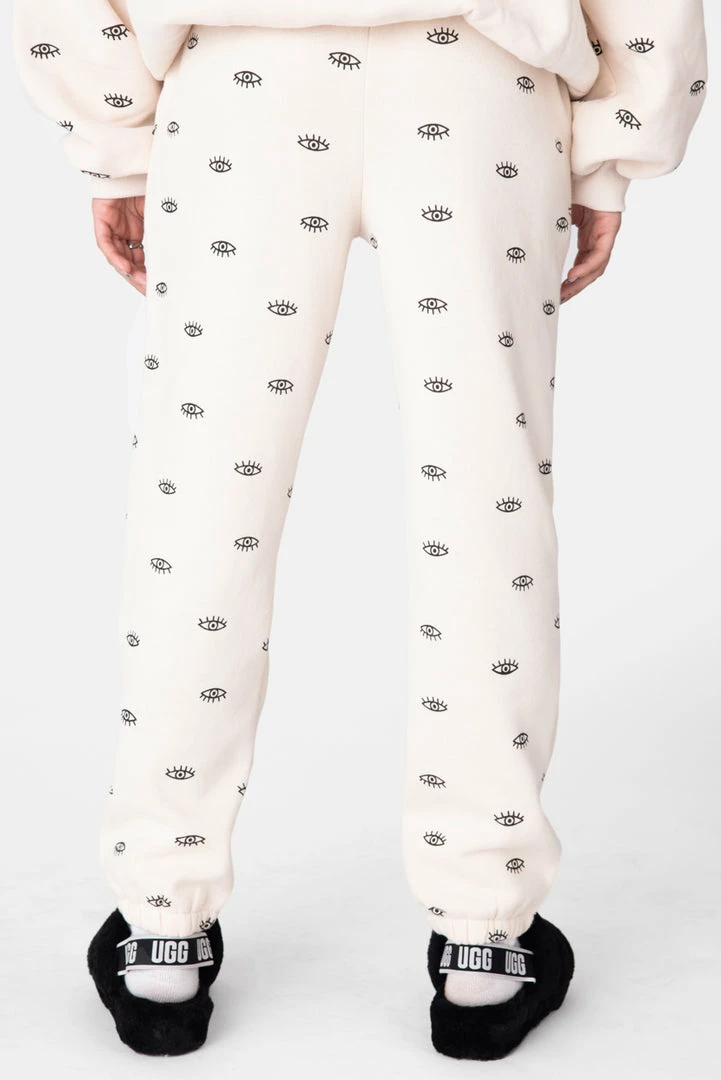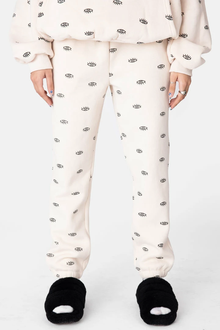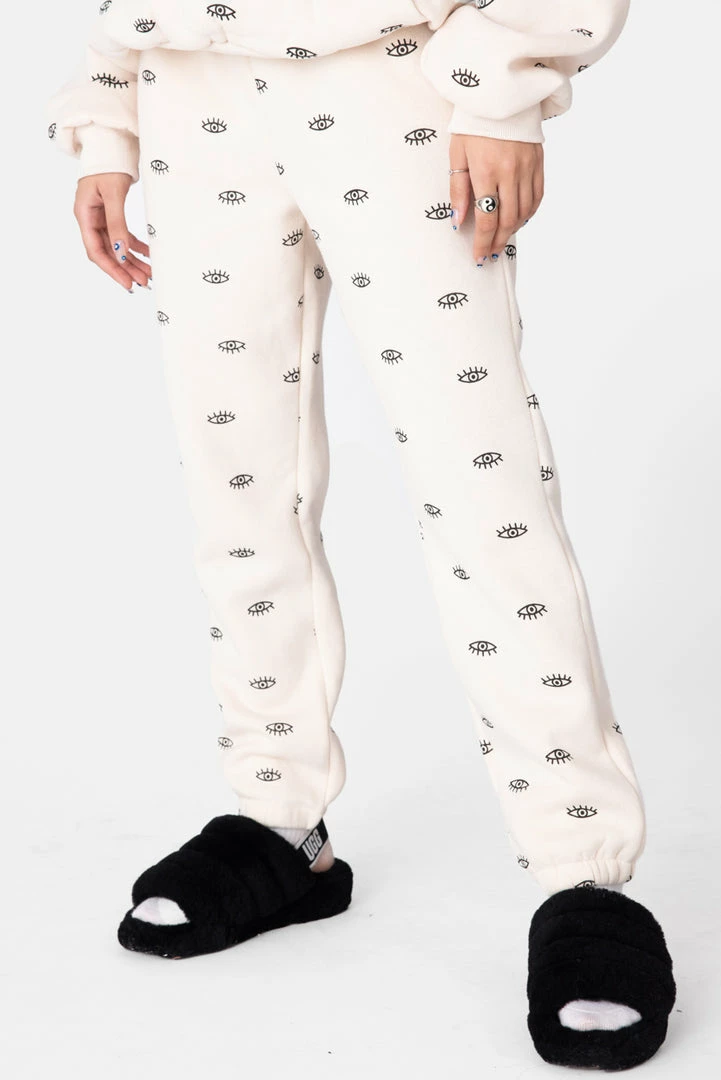 - All eyes on you, bb. Warm and super-comfy jersey sweatpants in an oversize fit with mega-fun graphic print all-over, elastic waistband, side pockets and fitted cuffs. Look no further and take it.