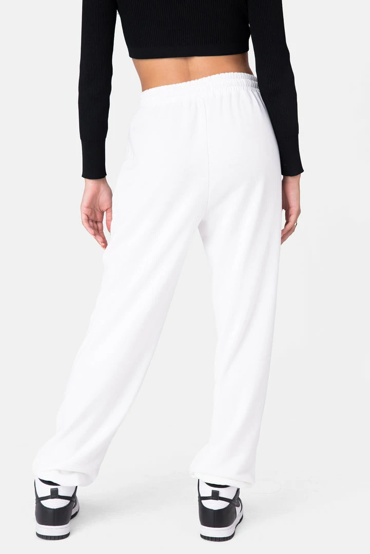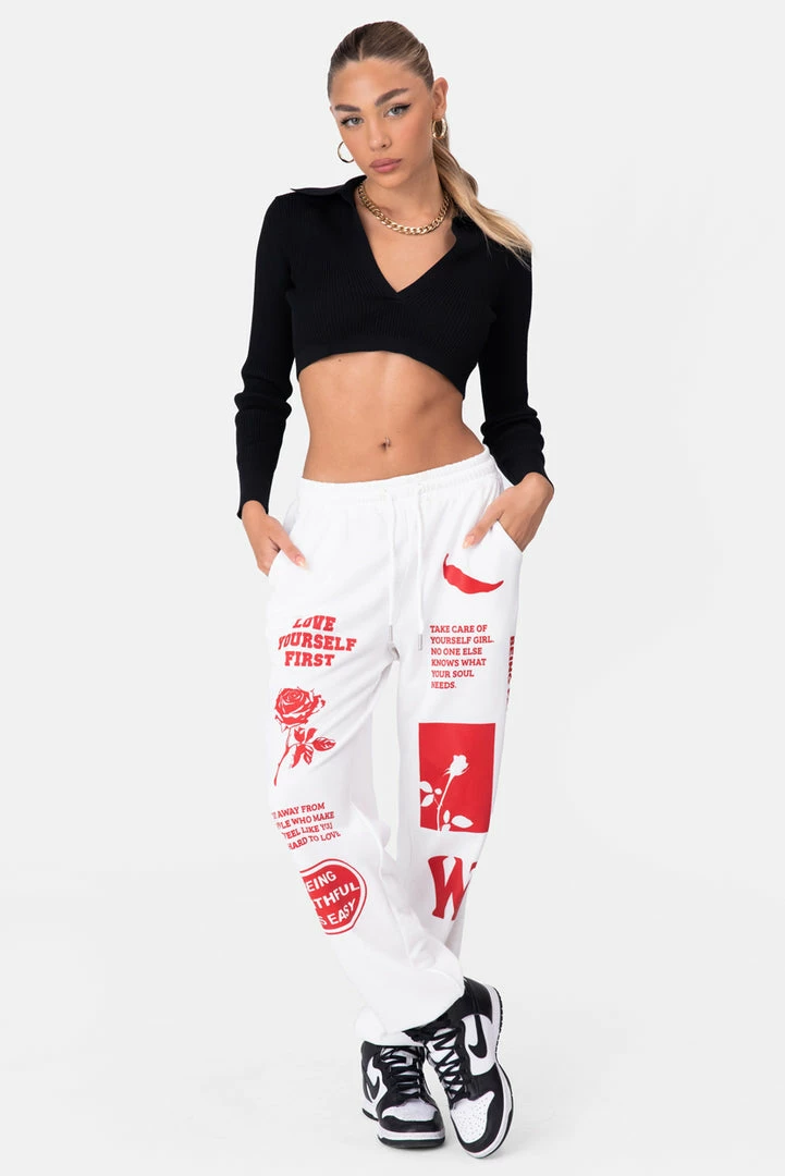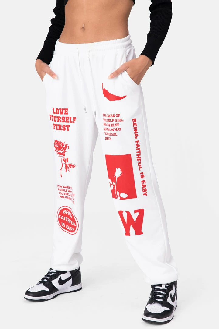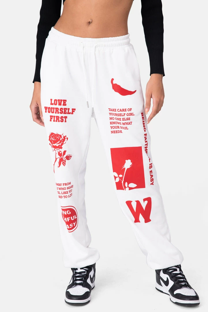 - Always love yo’self first, babe. Relaxed fit sweatpants featuring graphic print on the front, side pockets, an elastic waistband with drawstring and fitted cuffs.