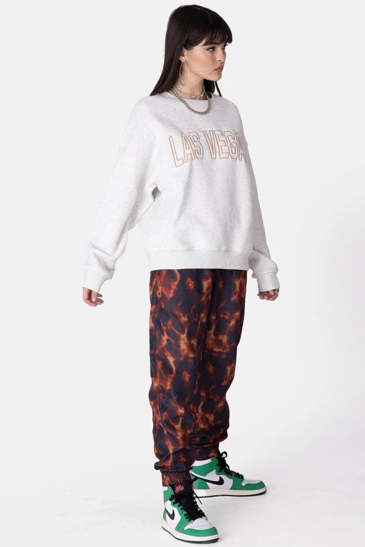 - Burn, bby, burn. Oversize fit nylon sweatpants in a graphic print all-over with an elastic waistband, side pockets and cuffed hem.