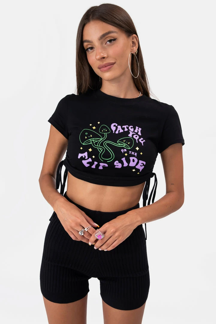 - See ya later. Cropped T-shirt with graphic print on the front, crewneck, short sleeves and ruched sides with pull strings.
