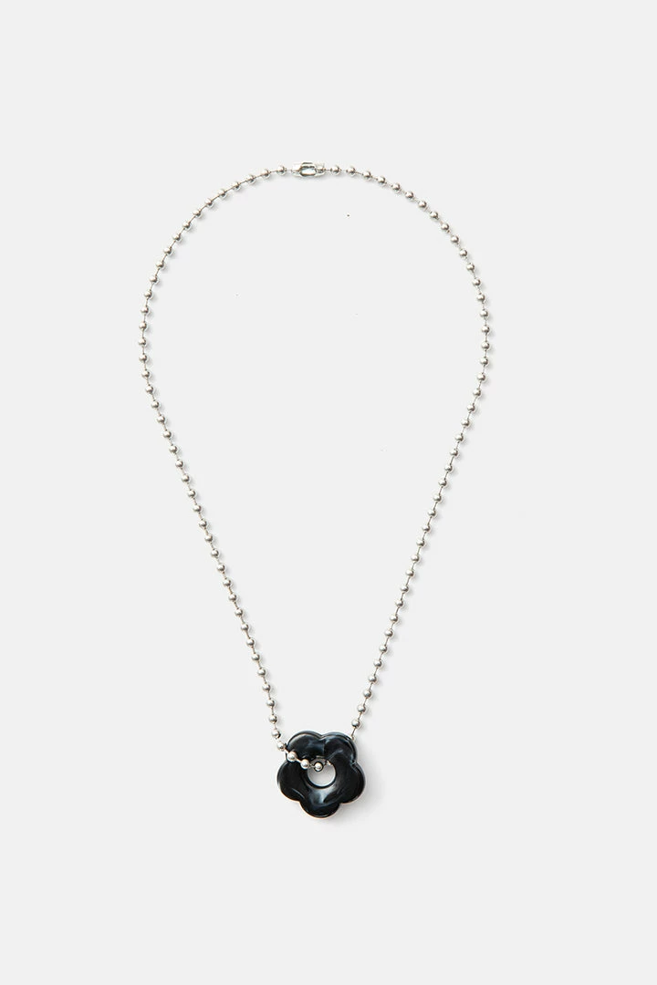 - Chain reaction. Dainty ball chain necklace in a metallic finish with plastic, flower-shaped pendant in marble finish and ball-chain fastening.