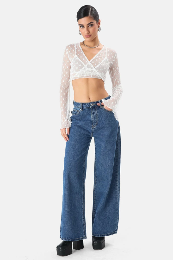 - I see right through you. Wrap top in mesh with flower pattern all-over featuring long tie strings and mega fun bell sleeves.