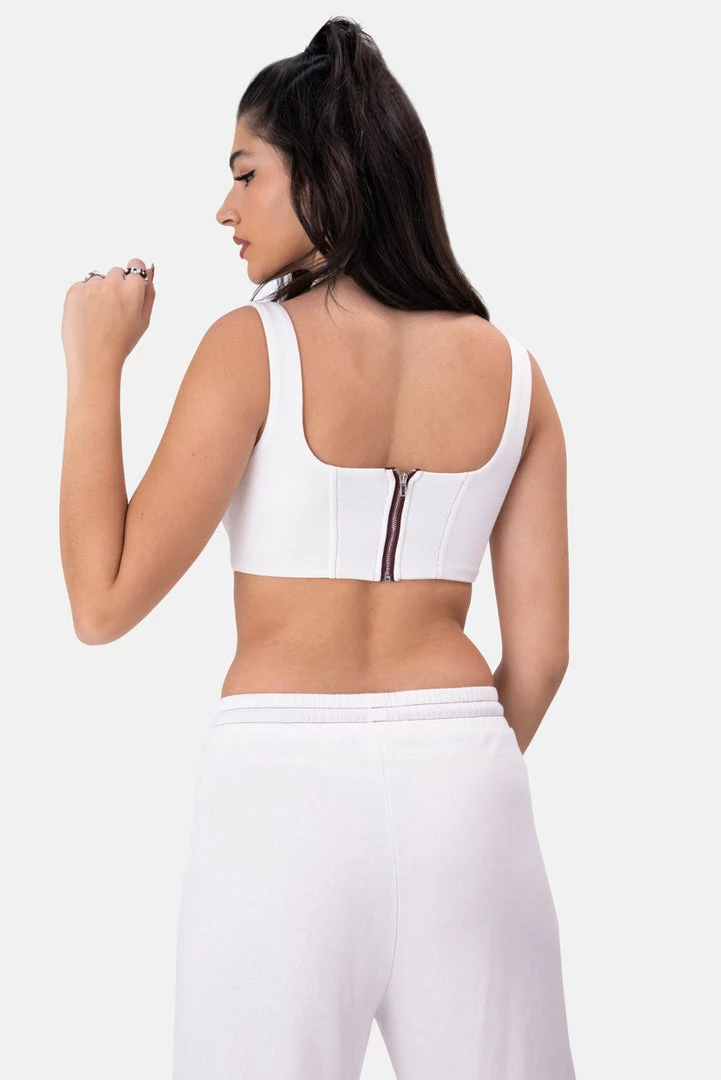 - Roll with the flow. Corset-style jersey crop top with a square neckline, zip closure in the back, embroidery in the front and contrast seam detail.