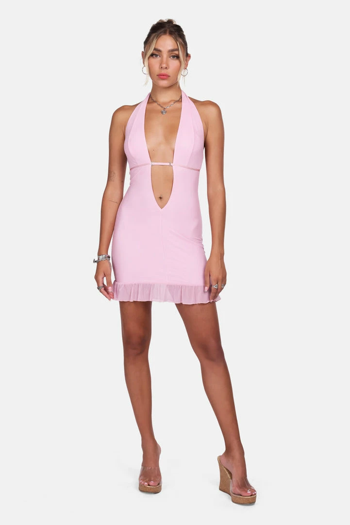 - Dressed to frill. Halter mini dress in mesh fabric featuring mega-plunging neckline with adjustable strap detail in the bust, inner lining and frilled hem.