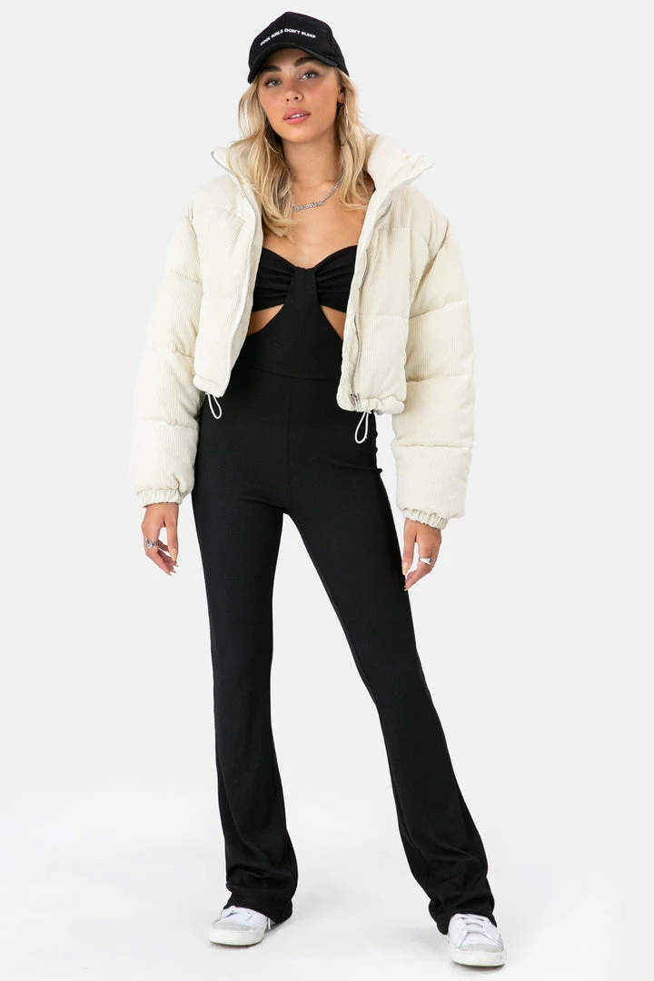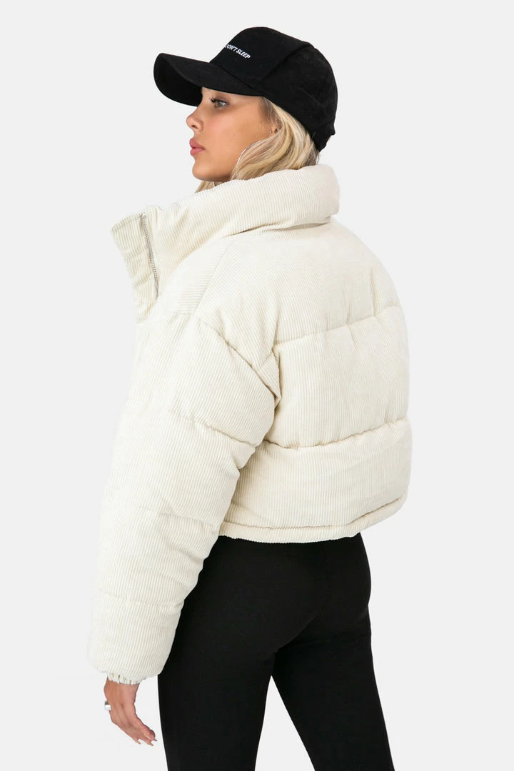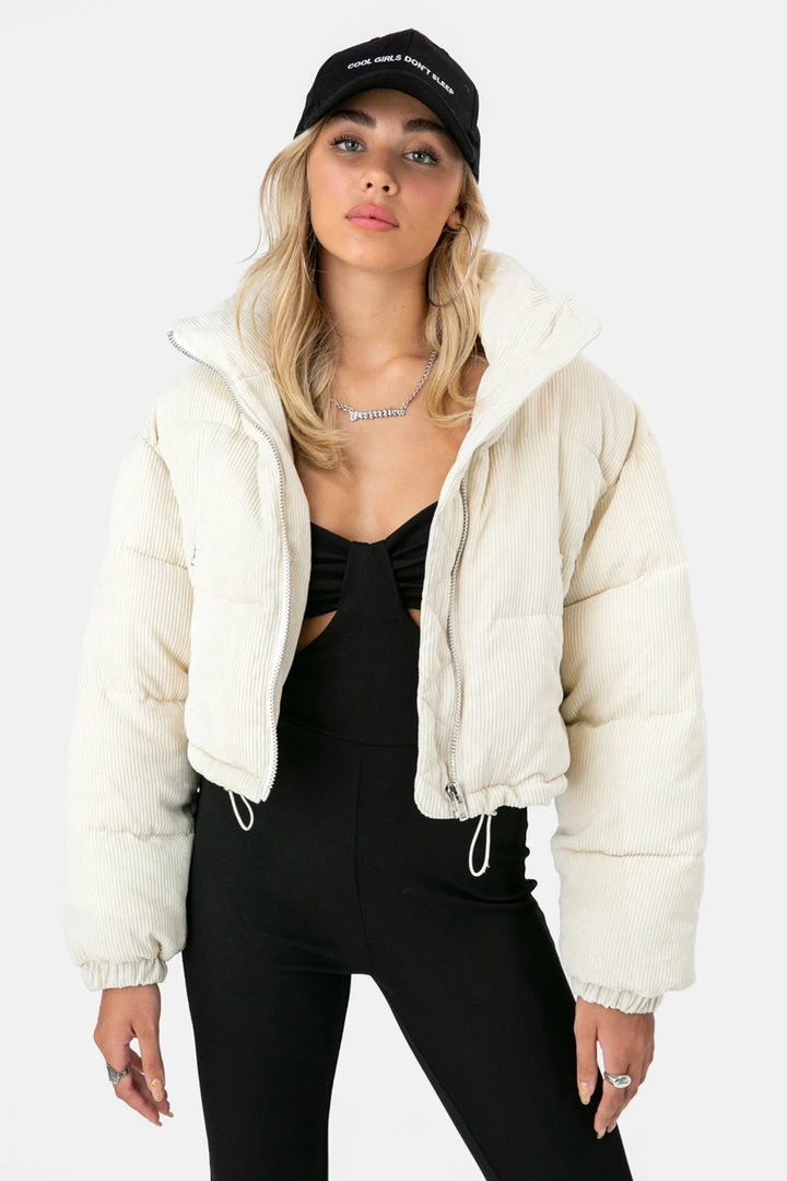 - Hey foxy lady, I like your style! This corduroy puffer jacket features a cropped hem with elastic pull strings, zip closure, standing collar, zip pockets and fitted cuffs. Swag.