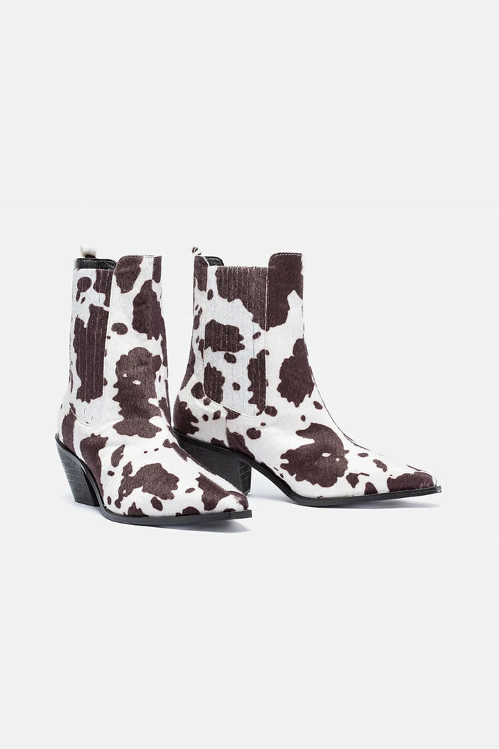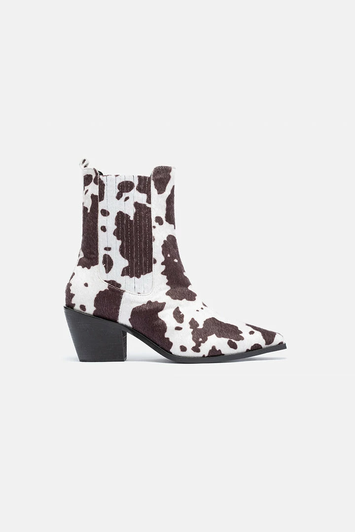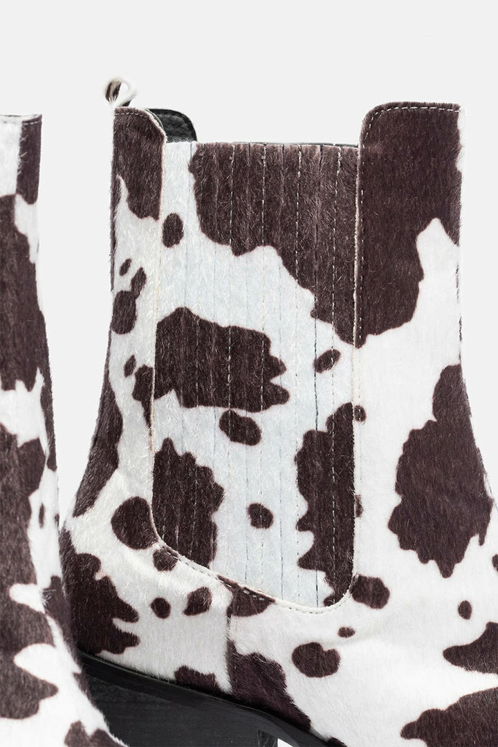 - Cowboy chic is all the rage, rn. Pointy toe Chelsea boots with all-over textured cow print, elastic side inserts, back pull loop and a block heel. Make a Moo on it.