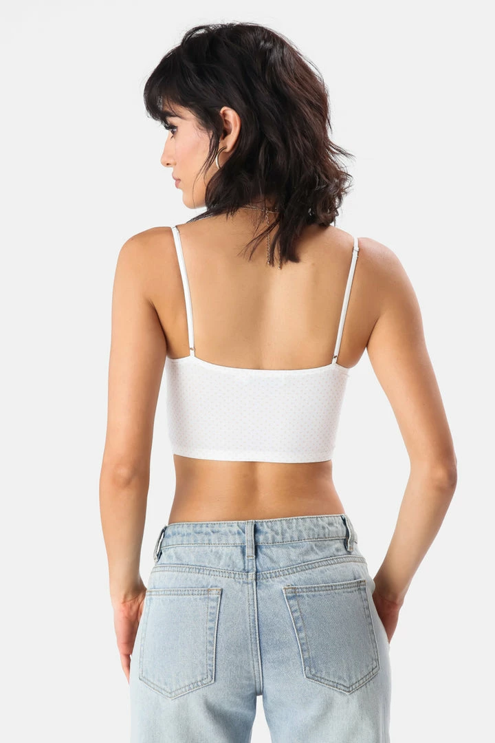 - Itโs giving romance. Corset-style crop top in all-over polka-dot pattern with sweetheart neckline and adjustable spaghetti straps. Including cup design with an underwire, front eye and hook closure, and corset seam detail.
