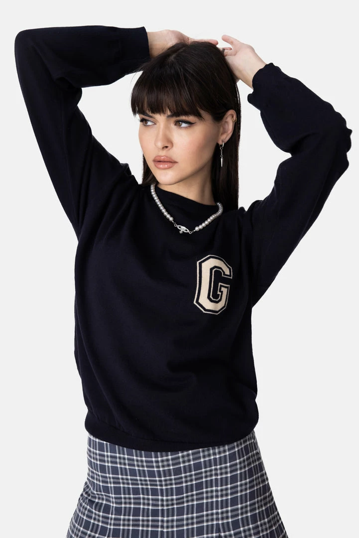 - Dirty 30, what? Crewneck knit sweater with woven-in graphic print in the front and back, plus fitted cuffs and hem.