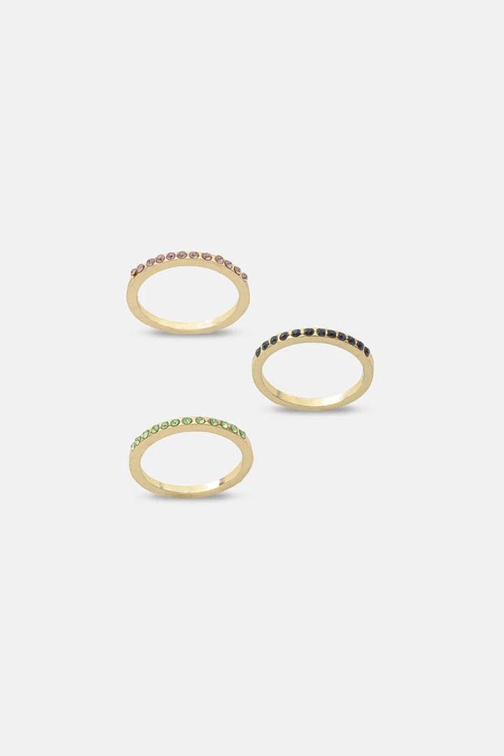 - Stack ‘em up. Set of 3 thin metallic rings in mixed design with colorful rhinestones.