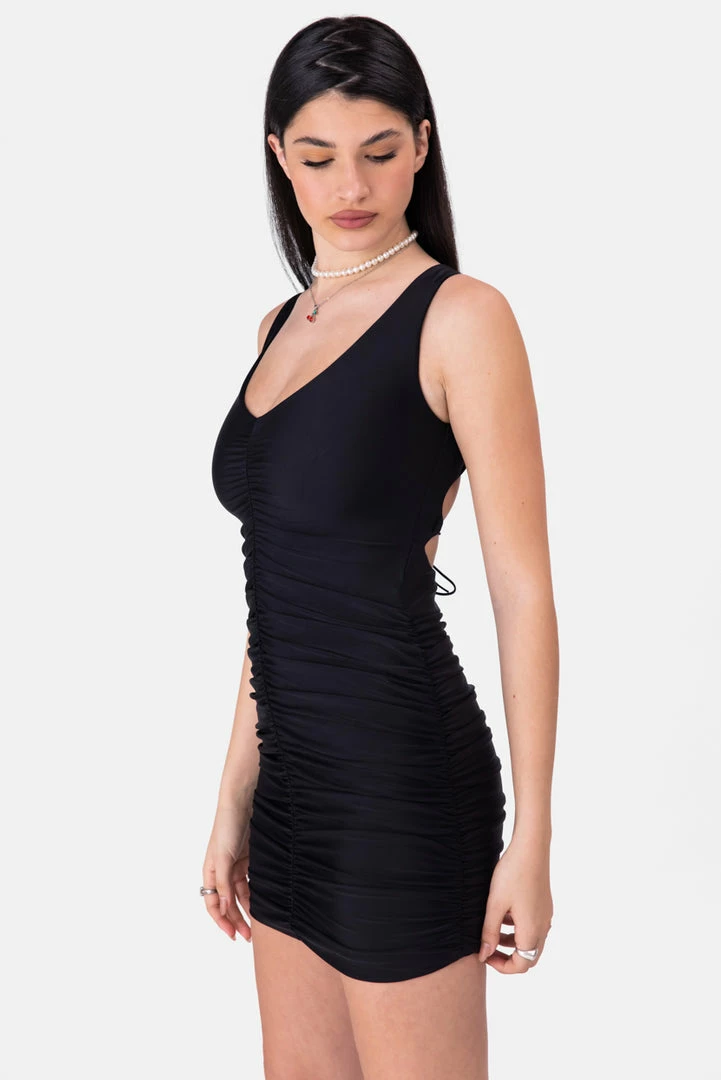 - You should 100% ruch into it. Bodycon ruched mini dress with V neck and an open back with tie strings.