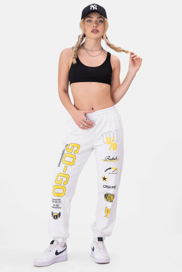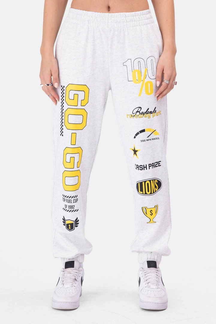 - Cominβ to the races? Relaxed sweatpants with graphic print on the front, elastic waistband, fitted cuffs and side pockets in a natural waist rise.