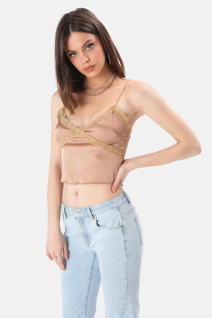 - Keep it golden, bae. Cropped cami top in satin finish featuring a sweetheart neckline, lace detail on the front and stretchy shoulder straps.
