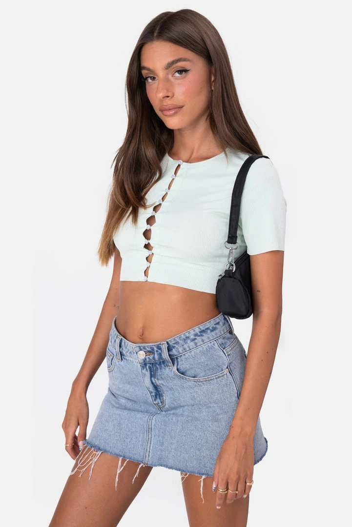 - Cuteness overload. Stretchy rib crop top with short sleeves, faux-pearl button closure, round neck and raw-cut outline.