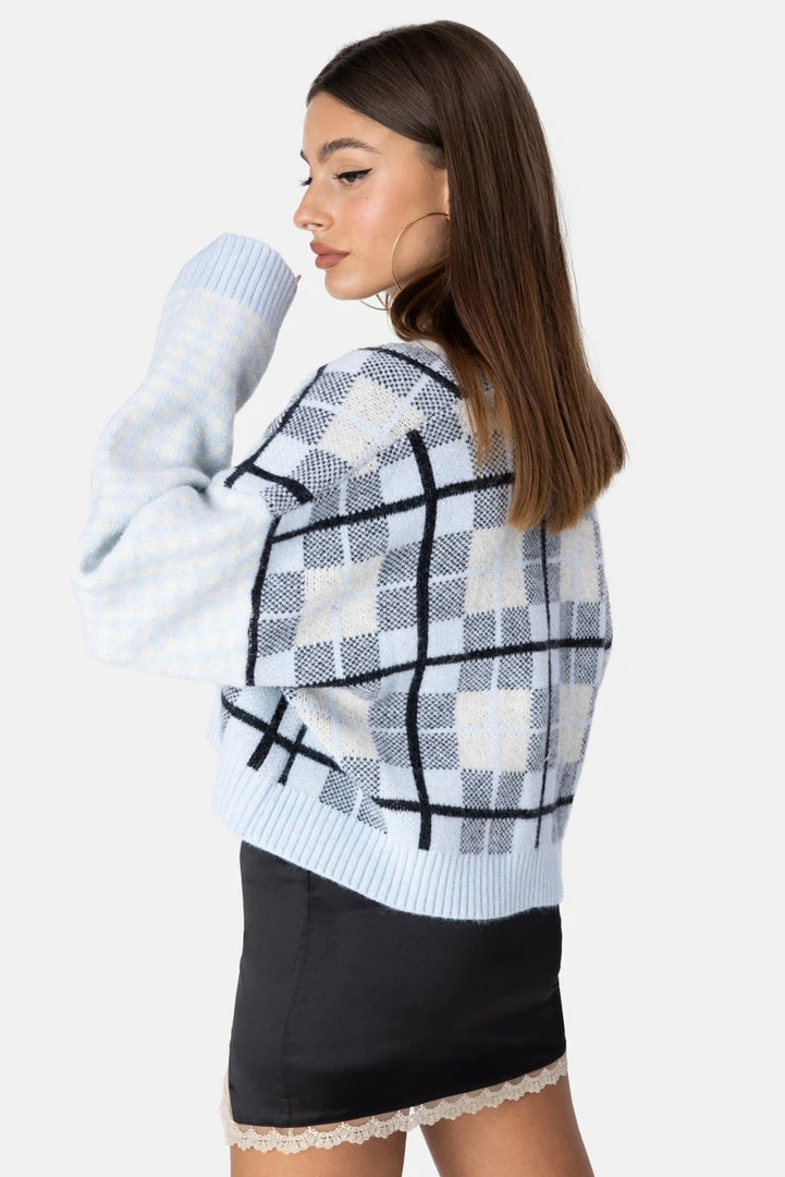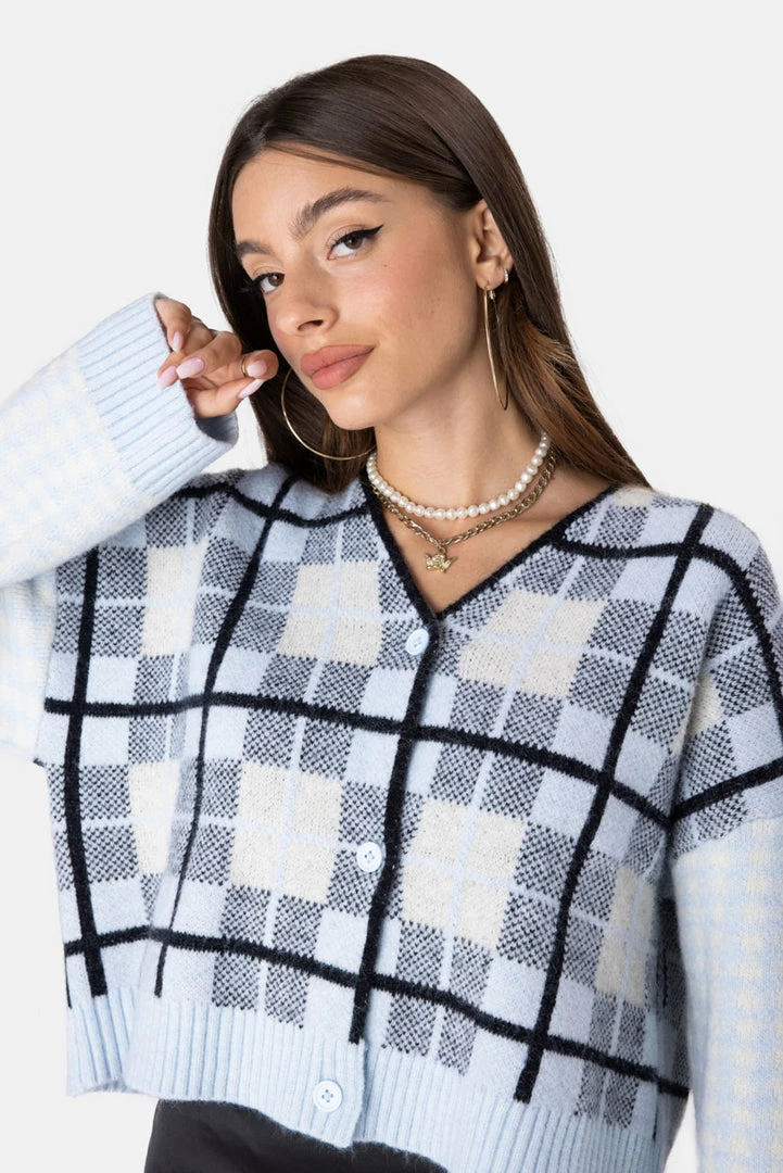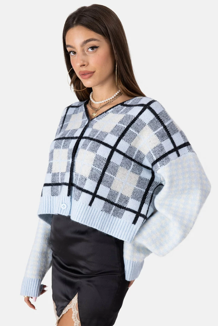 - Grid to see you, hun. This cropped knit cardigan comes in a mixed print, color-block style design with button closure, v neck, dropped shoulder line, plus ribbed cuffs and hem.