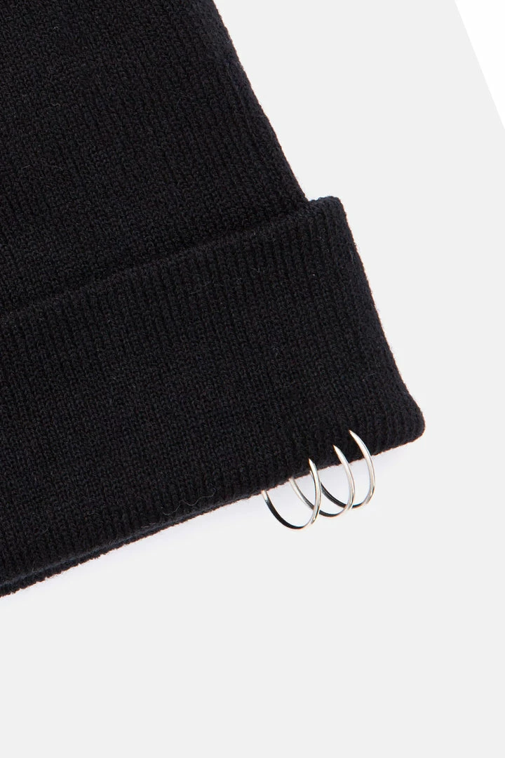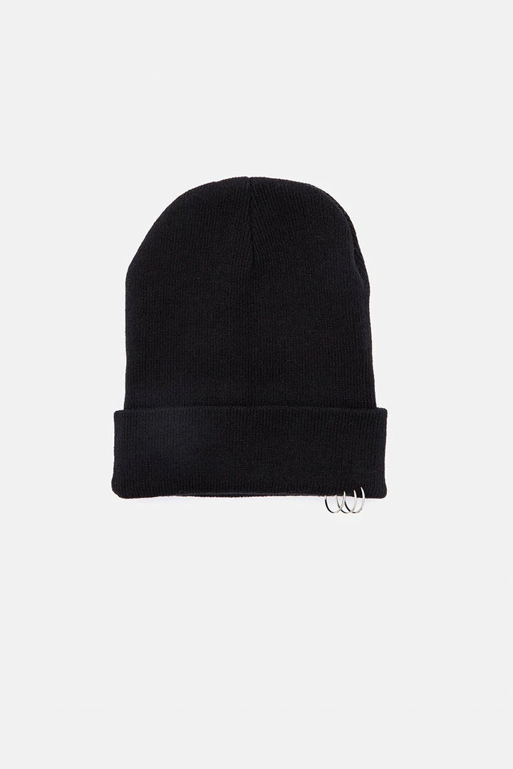 - Put a ring on it, the punk way. Stretchy knit beanie with metallic ring detail.