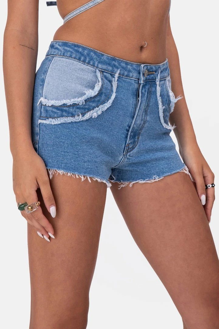 - Real hot girl denim summer. Denim shorts in a natural waist rise and color-clock design featuring fringed detail, button and zip closure, belt loops, side round pockets and raw-cut hem.