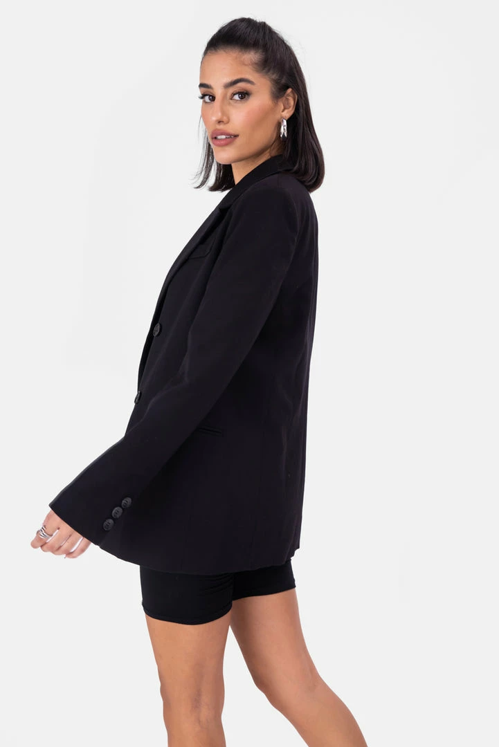 - All bossed up. Boxy fit blazer featuring padded shoulders, notch lapels, double-breasted button closure, chest faux-pocket, side pockets and button cuffs.