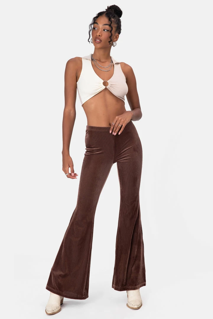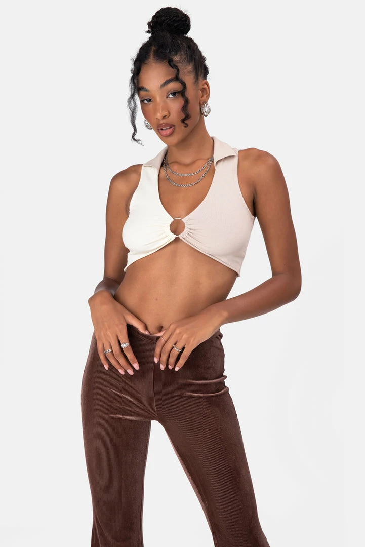 - Can ya top that? Super cropped top in a color-block design with metallic ring detail in the front, ribbed classic collar, V neck, raw cut hem and racerback.