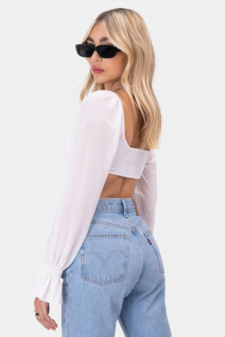 - Can ya top that? Super cropped top with sassy cup detail in the front, sweetheart neckline, long semi-sheer puff sleeves with an elasticized cuffs and ruched back.