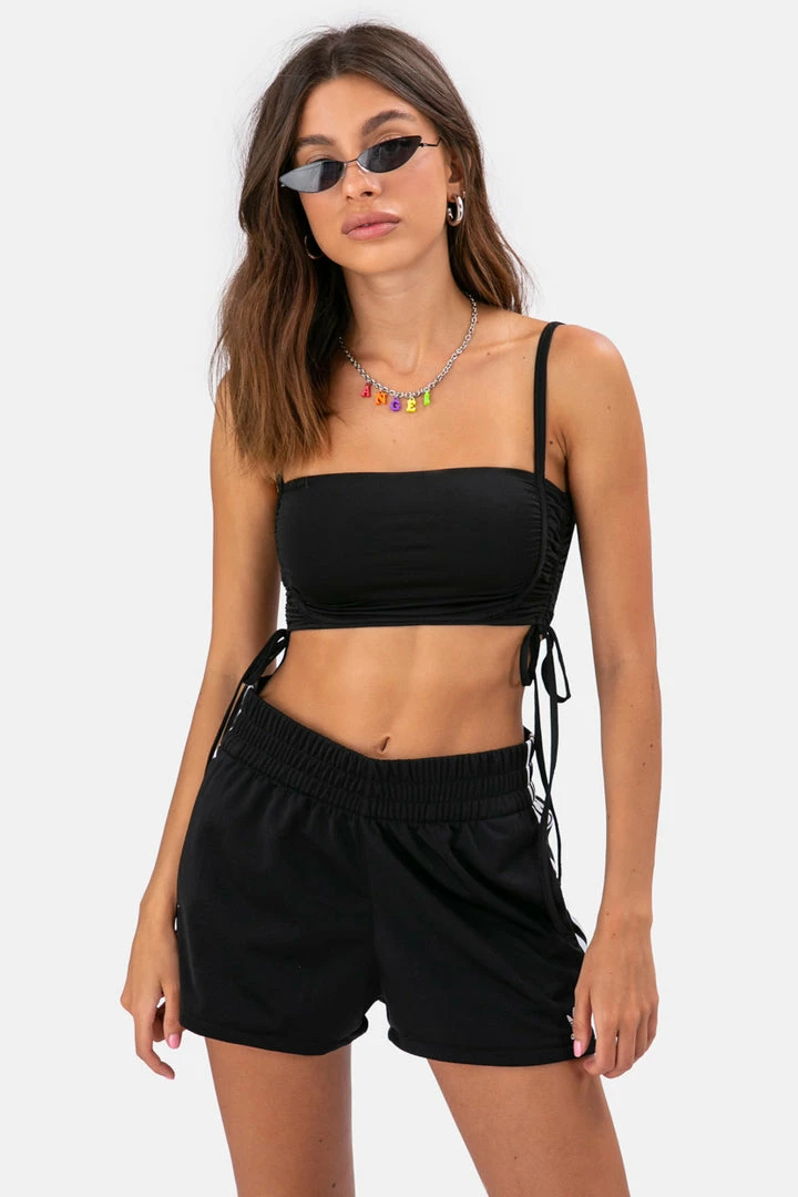 - This top has summer written all over it. Cropped tank featuring ruched sides with tie strings to top it off.
