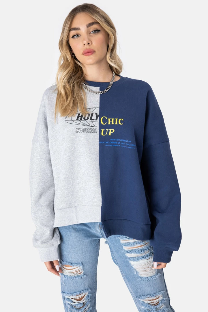 - All hail chic. Color-block style sweatshirt in a loose fit with graphic print on the front, asymmetric hem, crewneck, dropped shoulder line and fitted cuffs.