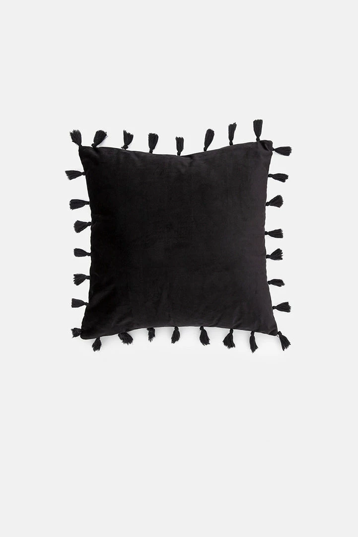 - Who wants to pillow fight? Square pillow cover in soft velvet with tassel outline.