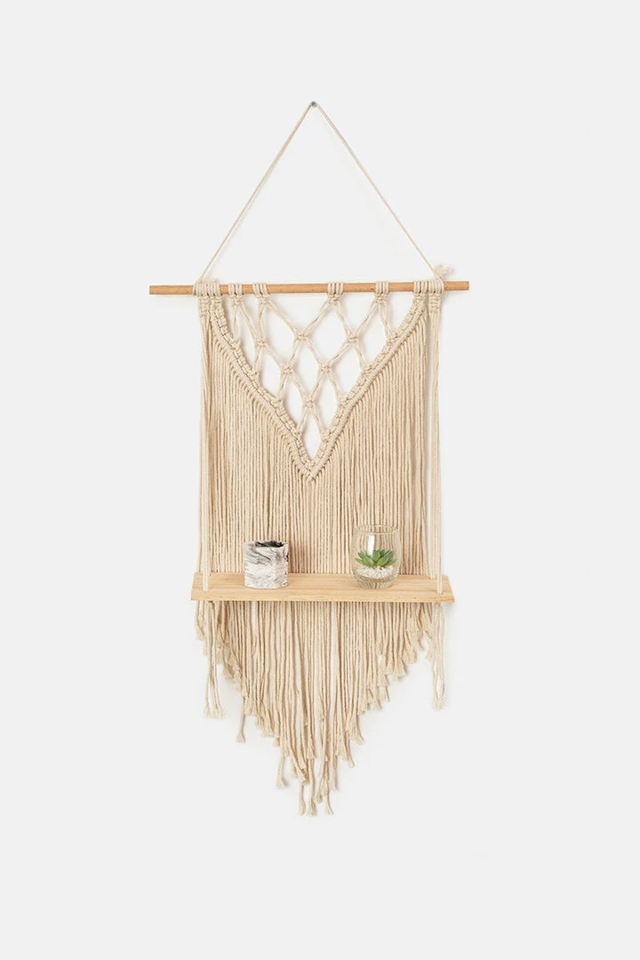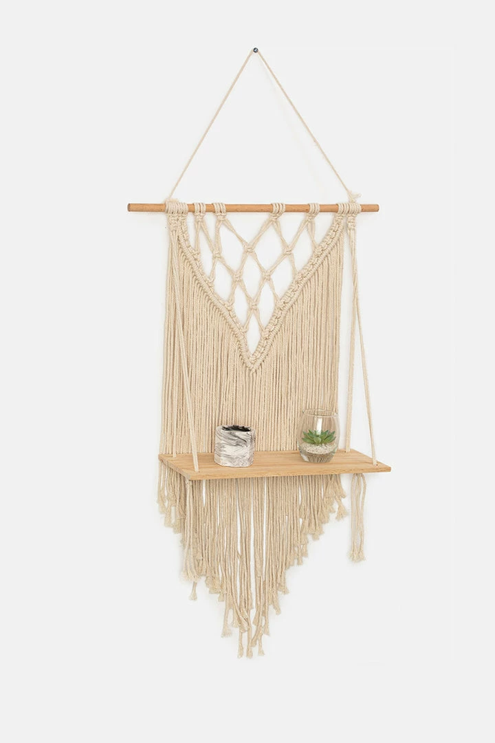 - Master of texture. Macramé wall hanging with rectangular wooden shelf.