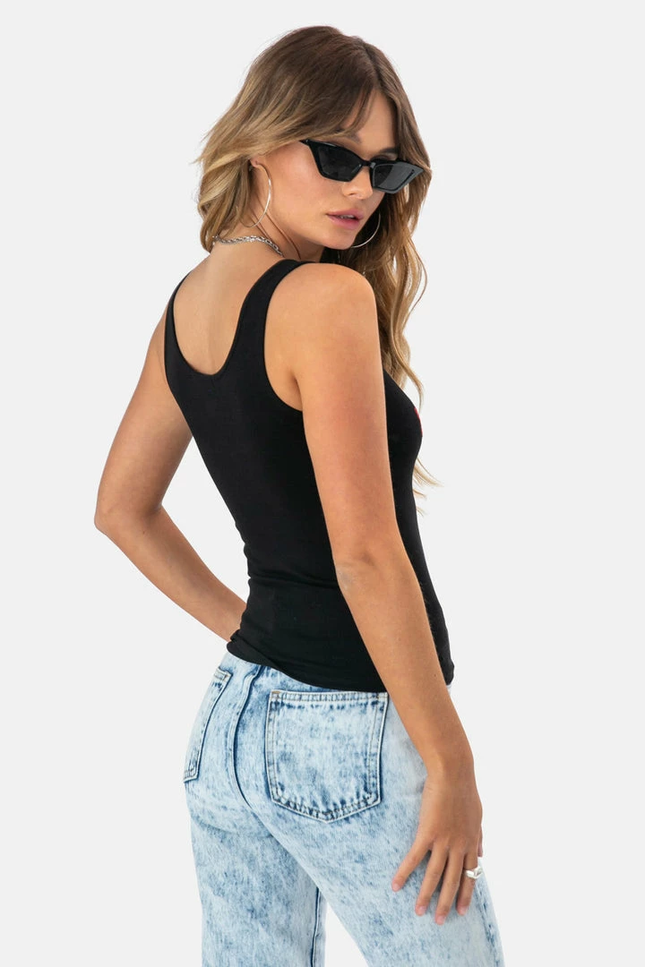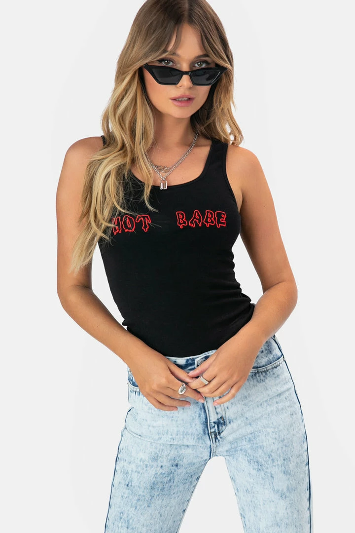 - Can you feel the heat?! Round neck tank top that’s cut close to the body featuring embroidered typography in front and slightly wide shoulder straps